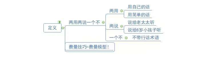 费曼技巧,亦同此理。对付一个知识枝节繁杂如发丝、富有内涵的想法,应该分而化之,切成小知识块,再逐个对 付,你最终能填补所有的知识缺口,否则,这些缺口将阻挠你理解这个想法。 “费曼技巧”是一种学习方法,是一种以教促学的学习方法,是通过假定模拟讲课的方式而将要学习的内容讲给自 己听。